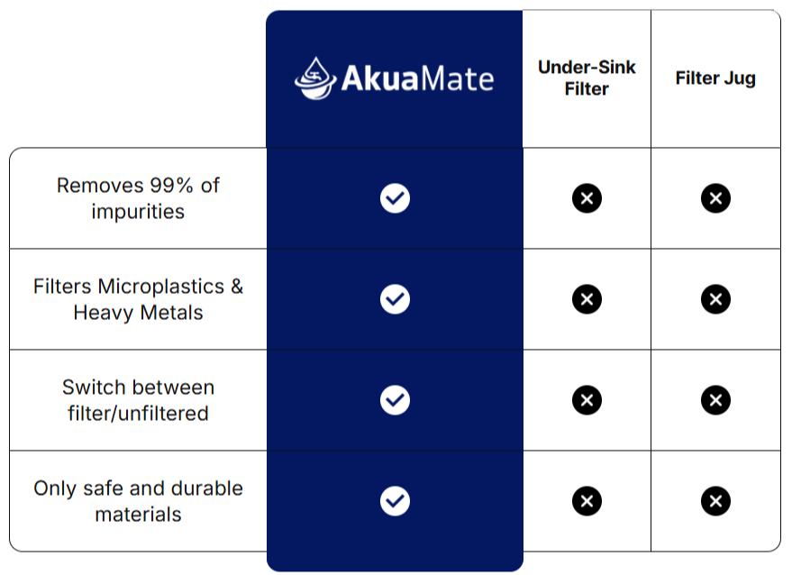 AkuaMate™ offers superior filtration, longer-lasting filters, and easy installation—clearly outperforming other water purifiers.